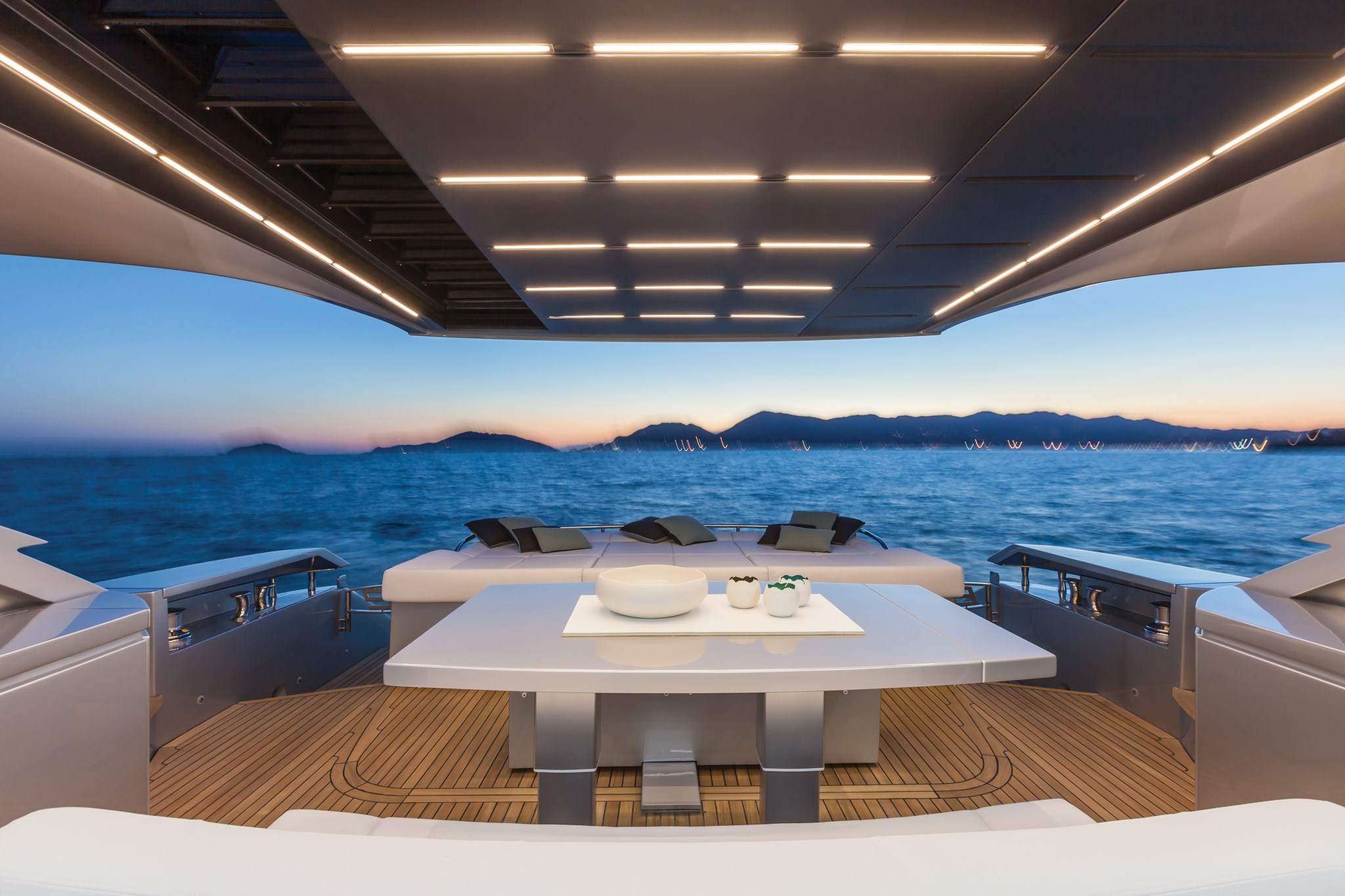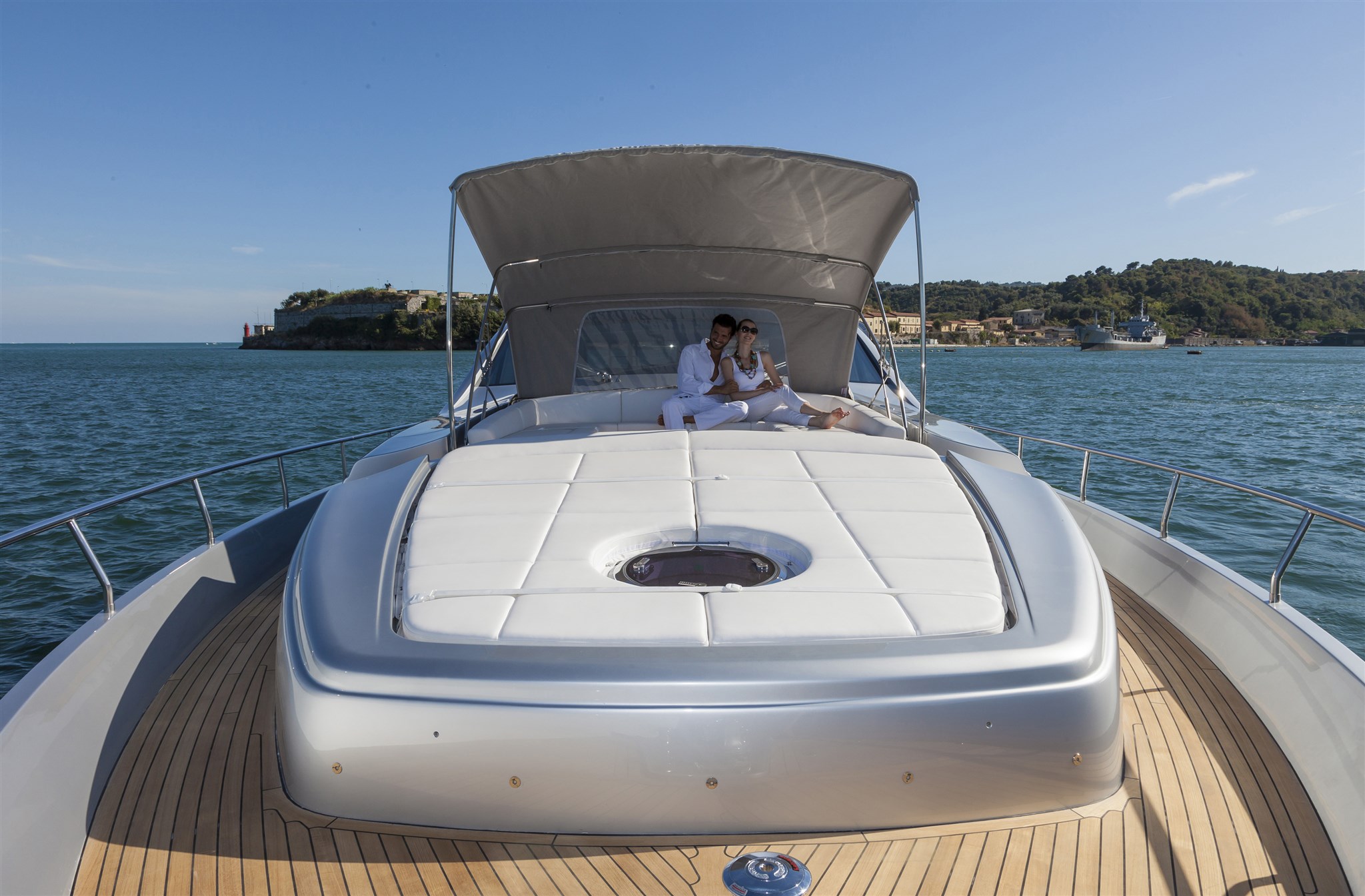 Ancora, Batterie, Camminamenti laterali in teak, Caricabatterie, Elica di poppa - stern thruster, Elica di prua - bow thruster, Garage per tender, Passerella, Porta ingresso, Porta laterale, Pozzetto Teak, Presa 220V banchina, Presa acqua banchina, Salpa Ancore Elettrico, Scaletta da bagno, Tavolo pozzetto, Tromba.